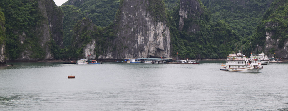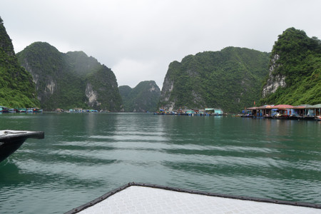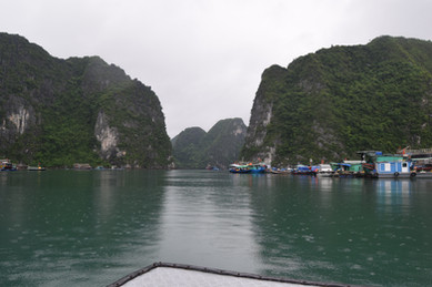 As we finished breakfast the ship was making its’ way through the karsts to Cua Van Floating Village at the heart of Ha Long Bay. It started raining as we arrived so we were all duly issued with green plastic ponchos before getting on the tender. Once we had been taken over to the village, we visited a small museum to learn about the people of the area. This was quite interesting, especially their belief in the sea spirit, who lives at the bottom of the sea. He also likes women a lot so the women of the village are not allowed to go out fishing in case the sea spirit decides to take them for his wife – capsizing the boat to do so. Similarly, they believe that, should they rescue someone who is drowning, they have prevented the sea spirit from claiming a servant and will have to replace the saved man themselves by drowning at a later date.